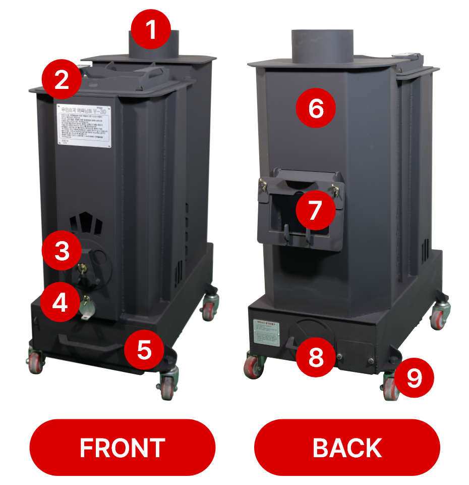• The surface temperature of the stove and chimney can range from 250 to 500℃. Be careful not to touch or burn yourself. Also, avoid placing flammable materials within 1.5m of the stove to avoid a fire hazard.