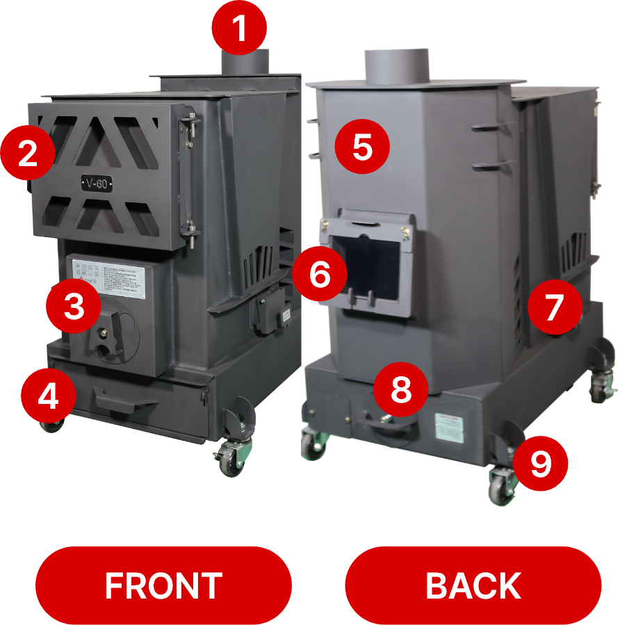 The surface temperature of the stove and chimney can range from 250 to 500℃. Be careful not to touch or burn yourself. Also, avoid placing flammable materials within 1.5m of the stove to avoid a fire hazard.