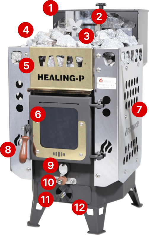 상부 올스텐 마감으로 부식을 방지하고 습식 사우나에도 안전하며, 내구성과 열 순환성이 뛰어납니다.
