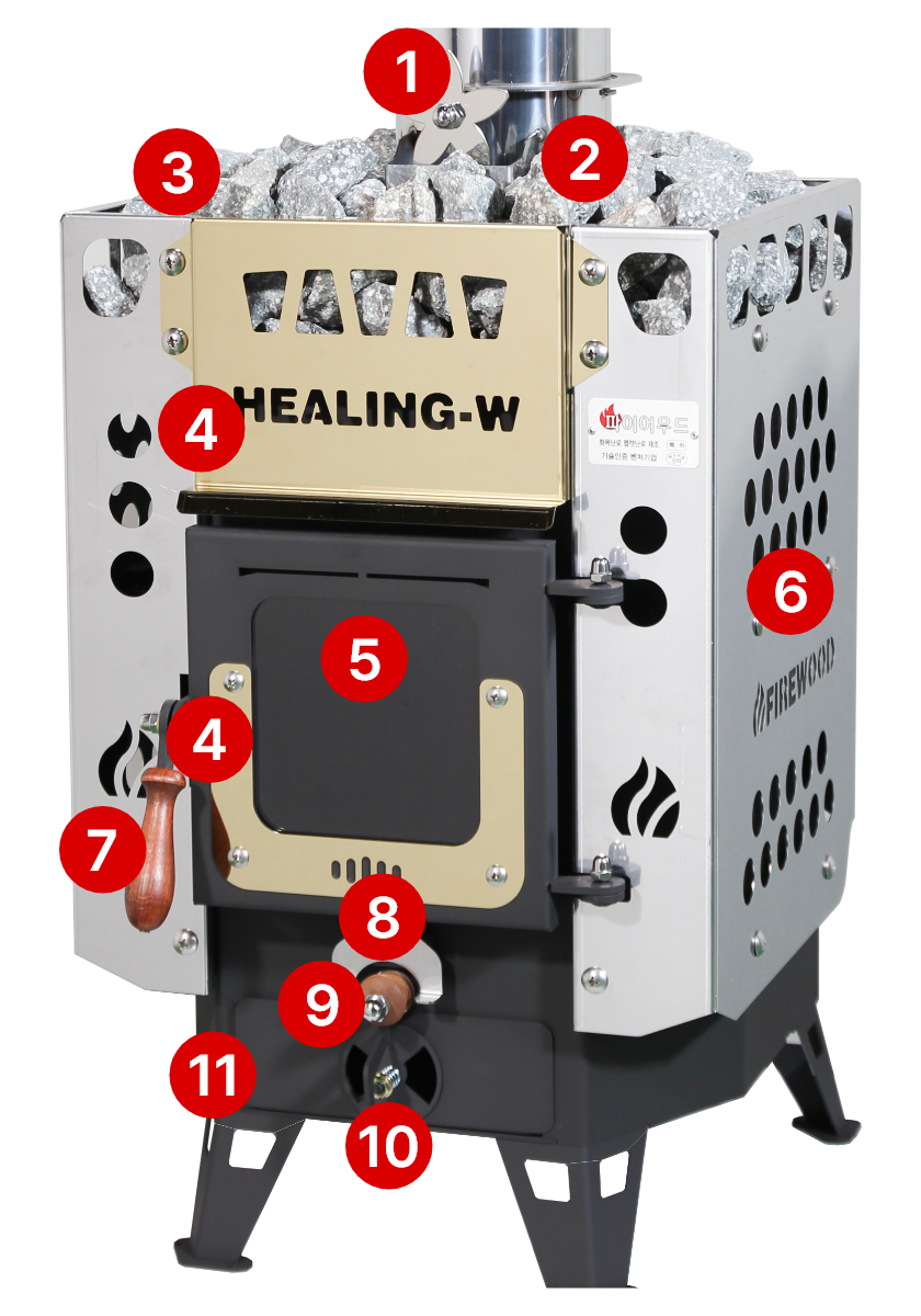 상부 올스텐 마감으로 부식을 방지하고 습식 사우나에도 안전하며, 내구성과 열 순환성이 뛰어납니다.