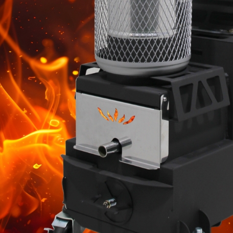 99% 이상 완전히 연소되는 구조로 배기열이 연통을 통해 외부로 배출되지 않아 열효율 100% 난로입니다.